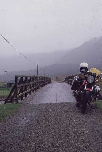 Bis zum Mittag meint es das Wetter am nächsten Tag gut mit mir. Den Großteil der heutigen Strecke(380 km) bin ich auf einspurigen Fahrbahnen mit "passing places" unterwegs durch schöne und einsame Gegenden. Der Inverpolly-District ist paradiesisch zum Motorradfahren. Über steile Straßen in oft schlechtem Zustand geht es durch Gebiete mit Heide- und Rhododendronbewuchs, oft auch vorbei an Azaleensträuchern oder einzeln stehenden Birken. Es ist eine moorige Gegend mit vielen kleineren Seen und Wasserfällen. Ständig muss man hier mit auf der Straße laufenden Schafe rechnen.