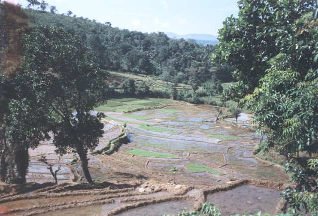 Die Strecke führte zunächst an den terrassenförmig angelegten Reisfeldern vorbei. Es ging kontinuierlich bergan an reißenden Gebirgsbächen entlang, durch die allgegenwärtigen Teeplantagen zu den Horton Plains, einer als Nationalpark ausgewiesenen Hochebene, wo wir erst nach Entrichten einer Gebühr hineingelassen wurden. - 4/11 - ![]()