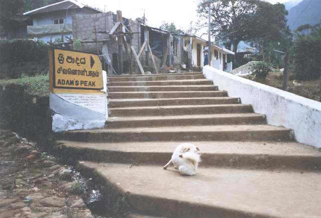 Nach etwa einer guten Stunde strammen Hinaufkletterns ist hier die Hälfte vielleicht geschafft. Ist noch ein schönes Stück bis ganz oben. Hier wurden wir wieder von dem "Mönch in leuchtend Orange mit Regenschirm" eingeholt, den wir zuvor schon einmal überholt hatten. Zu dumm, dass wir den Gipfel wegen der hereinbrechenden Dunkelheit an diesem Tag nicht mehr erreicht haben, aber der Abstieg im Dunkeln wäre zu gefährlich geworden. Uns war nicht klar, ob die Straßenleuchten entlang der Treppe in der Nacht eingeschaltet sind. In der Unterkunft machten wir am nächsten Morgen die Bekanntschaft von Sabine und Sabine. Beide waren von Hikkaduwa am Vorabend per Bus mit einem Führer angereist und hatten den Aufstieg um 3 Uhr in der Frühe gestartet. Auch sie hatten den Aufstieg nicht geschafft, weil sie wegen Magenproblemen wieder umkehren mussten. Sie berichteten, dass ihr Führer sehr zuvorkommend gewesen sei bei der Wanderung. So soll er ihnen mit Streichhölzern den oftmals schlecht beleuchteten Weg erleuchtet haben. - 9/11 - ![]()
