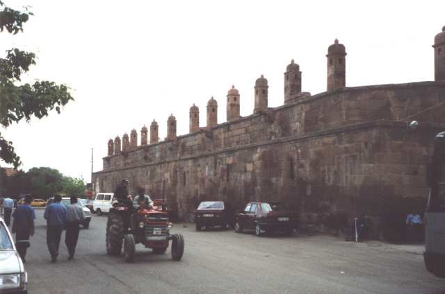 Die linke Zündkerze wurde vorsichtshalber ersetzt, weil von dieser Seite so ein komisches Ticken kam. Das brachte jedoch keine Besserung. Zumindest zündeten beide Seiten. Also beide Vergaser ab, obwohl ich sie im angebauten Zustand bereits morgens auf dem Hotelparkplatz mit der Luftpumpe bearbeitet hatte. Zuerst den rechten. Die gerissene Schwimmerkammerdichtung konnte erfolgreich mit Kaugummi geklebt werden. Die Düsen wurden nochmals ausgebaut und die Bohrungen so gut es ging mit der Luftpumpe angepustet. Das schlimmste war das Wiedereinsetzen der auf Risse überprüften Membran. Diese hatte sich nach Abnehmen des Deckels stark geweitet und wollte einfach nicht wieder in die Nut zurück, weil der Umfang jetzt größer geworden war. Das gleiche Spiel wiederholten wir mit dem 2. Vergaser. Zwischendurch kam eine Frau und wollte uns helfen. Wir verstanden jedoch nichts und hatten auch keine Zeit dafür in der prallen Sonne. Später kam noch ein Mann dazu, der mit Hand anlegte beim Einlegen der Membran. Die ganze Sache dauerte gut eineinhalb Stunden und die Abfahrt gelang uns deshalb erst am frühen Nachmittag. Bald zweigte die Straße ab nach Köse. Es folgten schöne Schotterstrecken in gutem Zustand. Die Landschaft war grandios. Vor Erzincan bogen wir rechts ab auf die E80, die sich autobahnähnlich zwischen die Gebirgszüge windet. Wir kamen auf 2160m Höhe, wobei wir an einigen Stellen noch Schneereste sahen. Gegen vier Uhr nachmittags machten wir eine Pause hinter dem Sakalrutan Gecidi Pass, wo wir beide unseren Hunger mit Köfte und Salat stillten. Die Bedienung war sehr freundlich und reichte uns sogar zum Empfang und Abschied die Hand. Einer der beiden hatte soweit wir verstanden auch schon mal eine kurze Zeit in Hamburg gearbeitet. Die Straße war gut befahrbar mit 100 bis 120 km/h. Kaum Schlaglöcher, so dass wir heute bis Sivas kamen, wo wir für 10 Mio. ein gutes Zimmer bekamen mit Abstellmöglichkeit für das Motorrad im Hoteleingang. Das Lenkkopflager mußte heute abend noch nachgezogen werden. Es hatte Spiel bekommen. Abends machten wir einen Spaziergang durch die sehr lebendige Innenstadt mit ihren vielen Geschäften. Auch eine Parkanlage mit Moschee und Sultanei sind vorhanden und luden zur Erforschung ein. Selbst eine Einkaufspassage kann man in Sivas finden. Das Motorrad konnten wir im Flur des Hotels abstellen. Dienstag 30.05.00. Nach dem Frühstück in einem Restaurant neben unserem Hotel brachen wir bald auf. Es war heute relativ früh für uns. Um zehn Uhr waren wir bereits unterwegs und fanden bald die 260, die entgegen meinen Erwartungen in einem sehr guten Zustand war. Keine Pässe auf dieser Strecke, die mit 100 bis 120 km/h befahrbar war. Noch vor Kayseri hielten wir an einem Market, um uns mit Haselnüssen, Keksen und Eis zu versorgen. Auch in Incesu legten wir eine kleine Pause ein und aßen im dortigen Park einige Kekse und Nüsse, wobei wir uns über die unbequeme Gestaltung der Parkbänke wunderten. In Ürgüp fanden wir im 2. Hotel für 20 Mio die heutige Unterkunft. Im Preis inkl. war neben dem Frühstück dieses Mal auch das Abendessen. Seite 14 / 18