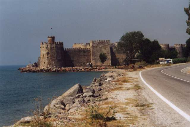 Bald hatten wir die mächtige Festung Anamur erreicht, wo ein deutschsprechender Pirat über 4 Mio. Eintritt von uns haben wollte. Ich wurde echt sauer und wir machten kehrt, ohne uns um die Burg weiter zu kümmern. Im Graben unter der Zufahrt zur Burg waren viele Wasserschildkröten zu sehen, die darauf lauerten, von den busweise angelieferten Touristen gefüttert zu werden. Vor Alanya machten wir die nächste Pause am Strand. Ich ging wieder ins Meer, Andrea sonnte sich. Anschließend gab es eine umfangreiche Mahlzeit u.a. mit einem frisch gebackenen Brot, so groß wie ein halbes Handtuch. Ab Alanya war Tourismus pur angesagt. Schon vorher kamen uns viele Suzuki-Jeeps mit hellhäutigen Insassen entgegen. Hier liefen die Touristen überall herum. Ein Mordsverkehr. Noch immer grandios sind die gewaltigen, zinnenbewehrten Befestigungen des Stadthügels mit seinen 146 Türmen. Im Altertum war Alanya ein gefürchtetes Seeräubernest. Der achteckige, 33 m hohe Turmbau am Hafen wurde 1224-28 als Eckpfeiler der Seldschukenfestung errichtet. Wir fuhren zur Burganlage hoch und hatten eine Superaussicht über die Stadt und das Meer mit Ausflugsbooten, die Touristen zu einer unten befindlichen Höhle schipperten, wo sie zum Schwimmen ausgesetzt wurden. Die Burg thront hier 250 m über einem tiefen Steilabfall zum Meer. Der restliche Weg bis Manavgat war uninteressant. Die Straße war autobahnähnlich. Überall gab es Baustellen und die Materialien, Geräte und Abfälle lagen am Wegrand. Wir trafen Coskun und Ayten im Hotel, das mit derzeit 60 bis 70 Gästen nur zu einem geringen Teil belegt war. Coskun konnte deshalb früh mit uns das Geschäft verlassen und wir fuhren zu seiner Wohnung. Es gab Türkische Pizzen, die Coskun besorgt hatte und selbstgemachten Salat zum Abendessen und türkisches Fernsehen. Samstagmorgen schliefen wir alle lange aus. Coskun ging vormittags ins Geschäft. In der Einkaufspassage unterhalb seiner Wohnung gab es ein gutes türkisches Frühstück für Andrea und mich, Ayten schlief noch. Danach gingen Andrea und ich ins Internet-Cafe nebenan, wo uns Coskun gegen Mittag antraf. Alle vier fuhren wir dann mit den Motorrädern zum Strand. Hier sind wir endlich Teil des großen Touristenerlebnisses geworden. Im Wasser waren wir auch bis es nachmittags anfing zu gewittern. Wir flüchteten ins Hotel und fuhren sobald es aufgehört hatte zu gießen zurück nach Manavgat. Von der Post aus telefonierte ich mit meiner Schwester wegen der mitzubringenden Kleidungsstücke. Sie hatte sich u.a. eine Lederjacke gewünscht. Abends unternahmen Andrea und ich einen Spaziergang durch Manavgat. Nach der Rückkehr Coskuns aus dem Hotel hatten wir vier auch noch ein ausgiebiges Abendessen. Seite 16 / 18