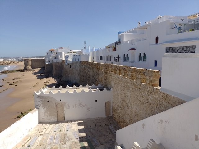Karte: die voraussichtliche Strecke mit aktuellem Standort: Der heutige Tag fühlte sich ein wenig wie ein leiser Abschied an. Als wir am Morgen Asilah hinter uns ließen, lag noch diese besondere Ruhe über dem Ort, die ihn in den letzten Tagen so angenehm gemacht hatte. Die weiß-blauen Mauern, die kleinen Gassen und das stetige Rauschen des Atlantiks verschwanden langsam im Rückspiegel, während wir uns auf die vergleichsweise kurze Etappe in Richtung Norden machten. Die Strecke selbst ist keine große Herausforderung, aber genau das macht sie so besonders. Man hat Zeit, die Umgebung wirklich wahrzunehmen. Immer wieder öffnen sich Blicke auf sanfte Hügel, Felder und kleine Ansiedlungen, die wirken, als hätten sie sich seit Jahrzehnten kaum verändert. Esel stehen am Straßenrand, Bauern bearbeiten ihre Felder, und zwischen all dem verläuft die Straße wie ein ruhiges Band durch die Landschaft. Ein besonderes Highlight auf dieser kurzen Fahrt war der Abstecher beziehungsweise die Passage am Barrage 9 Avril. Dieser Stausee liegt eingebettet in eine überraschend bergige, fast schon wilde Landschaft. Die Region hier wirkt deutlich grüner als viele der Gegenden, die wir zuvor durchquert haben. Das liegt nicht zuletzt an der Bedeutung des Staudamms: Er wurde in den 1940er Jahren während der französischen Protektoratszeit errichtet und dient bis heute der Wasserversorgung der Region um Tanger. Rund um den See breiten sich Hügel und bewaldete Flächen aus, die einen starken Kontrast zu den trockeneren Landstrichen weiter südlich bilden. Beim Fahren entlang dieser Gegend hat man immer wieder kurze Ausblicke auf das Wasser, das ruhig zwischen den Hügeln liegt. Es ist eine dieser Landschaften, die man so in Marokko nicht unbedingt erwartet – weniger Wüste, mehr Mittelmeerklima, fast schon europäisch anmutend. Gleichzeitig begegnet man auch hier wieder dem ganz typischen marokkanischen Alltag: kleine Straßenstände, vereinzelte Cafés, Männer, die im Schatten sitzen und Tee trinken, während das Leben gemächlich vorbeizieht.