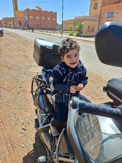 Bild: Auf dem Weg zur Himmels-treppe kommen wir durch ein kleines Dorf. Ein Vater hält uns an und bittet darum, seinen kleinen Sohn einmal auf unseren Motor-rädern fotogra-fieren zu dürfen. Natürlich sagen wir sofort ja. Für den Jungen ist es ein riesiges Erlebnis – und für uns ein schöner, ehrlicher Moment fernab jeder Touristenroutine. Wir erreichen schließlich den Abzweig zur soge-nannten Himmels-reppe (oft auch „Escalier Céleste“ genannt) – eine bizarre Instal-lation mitten in der Wüste: eine Treppe, die scheinbar ins Nichts führt. Sie wurde als Kunstprojekt errichtet und ist heute ein beliebtes Ziel für Offroad-Fahrer.