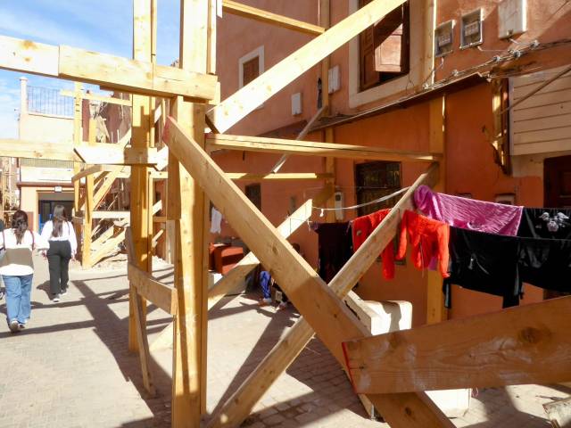 Da wir heute recht früh unterwegs waren, hielt sich die Anzahl der Touristen anfangs noch in Grenzen. Mit vielen schönen Bildern und Eindrücken ging es nach unserem Besuch zu Fuß hinein in die Souks, wo wir uns mit einer kleinen Zwischenmahlzeit vor einem Straßencafé wieder stärken konnten. Nach dem Beben im letzten Jahr herrscht in Marrakesch eine seltsame Normalität. Als ob die Stadt schnell vergessen wolle, was vorgefallen ist. Auf den ersten Blick sieht man auf dem Jemaa al-Fna kaum Schäden, nur der Turm einer Moschee ist eingestürzt. Aber viele Häuser in der Medina hat es übel erwischt. Der vordere Teil eines Gebäudes ist eingestürzt, so dass man in den Innenhof mit seinen maurischen Bögen blicken kann. Bei einem Gang durch die Medina sind auch sonst immer wieder eingestürzte und beschädigte Gebäude zu sehen.