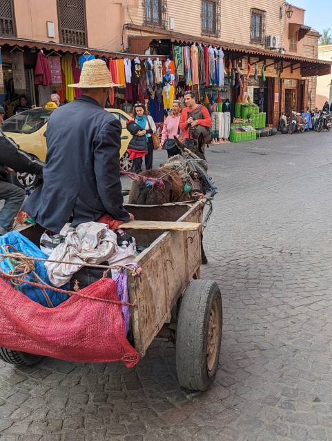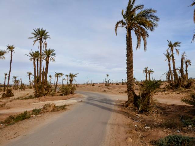 Mit dem Roller auf Erkundungstour durch Marrakesch und UmgebungEs gibt Städte, bei denen ganz allein der Klang des Namens Fernweh in uns hervorruft. Marrakesch ist eines dieser Ziele. Auf unserer 8tägigen Tour ließen wir uns wieder einmal verzaubern vom Flair und den zahllosen Sehenswürdigkeiten dieser einzigartigen Stadt.Eine Reise vom 12. bis 19.01.2024Karte: unsere Stationen Montag Morgen: die ersten Quads werden bereits unterhalb des Hotels gestartet. Wahrscheinlich wird gleich ein Bus mit Touristen auftauchen, um mit ihnen die Wüste zu erkunden. Ein Ziegenhirte treibt seine Herde hinein in Richtung Flussbett, das immer noch ausgetrocknet ist. Eigentlich müsste es jetzt im Winter Wasser führen, doch die letzten Jahre ist einfach zu wenig Niederschlag gefallen. Wir wollen uns heute den Bahia-Palast und den Pavillon de Menara anschauen. Beide Ziele sind innerhalb des Stadtbezirk von Marrakesch zu finden. Die Fahrt durch die der Stadt vorgelagerten Palmenhaine führte uns auf einer kleinen Straße wieder vorbei an einigen mit bunten Decken gesattelten Kamelen, die mit ihren Führern auf Kundschaft warteten. Die Palmenhaine werden oft als touristische Attraktion genutzt und sind ein wichtiger Bestandteil der Landwirtschaft in der Region, da sie u.a. für die Produktion von Nahrungsmitteln und Baumaterialien genutzt werden können.