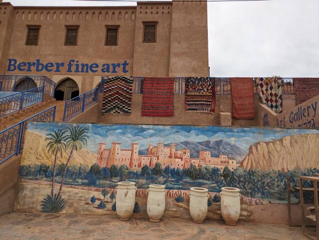 Bild: im Atlas-Gebirge kurz vor Asni Vor einigen Häusern sahen wir auch wieder Berberteppiche mit den traditionellen Motiven der Berber Kultur, die auch heute noch ein beliebtes Souvenir aus Marokko sind. Doch woher kommt diese Teppichknüpfkunst eigentlich genau, und welche Rolle spielt sie im Leben der Berber heute noch. Die Teppiche dienen für die Berber als Unterlage zum Schlafen, werden an die Wand gehängt als Dekorations-Objekt und ab und zu sogar als Bekleidung verwendet.