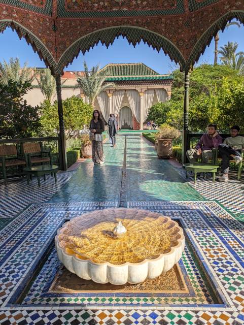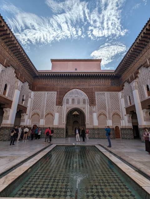 Mit dem Roller auf Erkundungstour durch Marrakesch und UmgebungEs gibt Städte, bei denen ganz allein der Klang des Namens Fernweh in uns hervorruft. Marrakesch ist eines dieser Ziele. Auf unserer 8tägigen Tour ließen wir uns wieder einmal verzaubern vom Flair und den zahllosen Sehenswürdigkeiten dieser einzigartigen Stadt.Eine Reise vom 12. bis 19.01.2024Karte: unsere Stationen Mittwoch, Tag 6: Bei einem Aufenthalt in Marrakesch gehört die Besichtigung der Medersa Ben Youssef zum Pflichtprogramm. Das sollte also unser heutiges erstes Ziel sein.