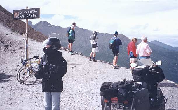 Alpen-Tour 98Auf Ölspuren durch die AlpenAm 4.7.98 starteten Andrea und ich zu einer 2wöchigen ca. 5.000 km langen Motorradtour durch die Alpen, die uns im Uhrzeigersinn über Bayern, Tschechien, Österreich, Slowenien, Italien und Schweiz bis nach Frankreich und zurück führte.Die Durchquerung der Cottischen Alpen führte auf den Col de Vars (2111 m) und bald danach auf den Col dÍzoard (2360 m). Unterhalb des Col dÌzoard gab´s wegen des Zugangs zur Toilette wieder einen Cappucchino - sehr sehr klein.
