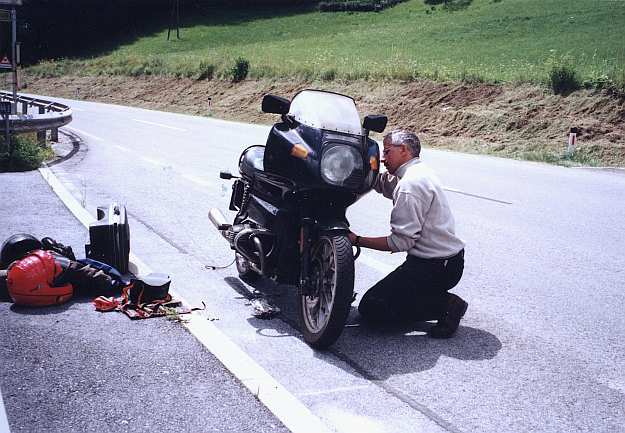 Zwischendurch jedoch gab es wieder einmal eine kleine Schrauberei. Die Anschlussstutzen des Ölkühlers waren bei der Panne auf der Autobahn nicht richtig angezogen worden. Hierdurch war wieder ca. 1l Motoröl ausgetreten und hatte den Hinterradreifen völlig verschmiert. In Rechtskurven hatte er wiederholt auf sich aufmerksam gemacht, bevor wir anhielten. An der nächsten Tankstelle kauften wir 2l Motoröl zu einem horrenden Preis von ca. 50 DM!!!