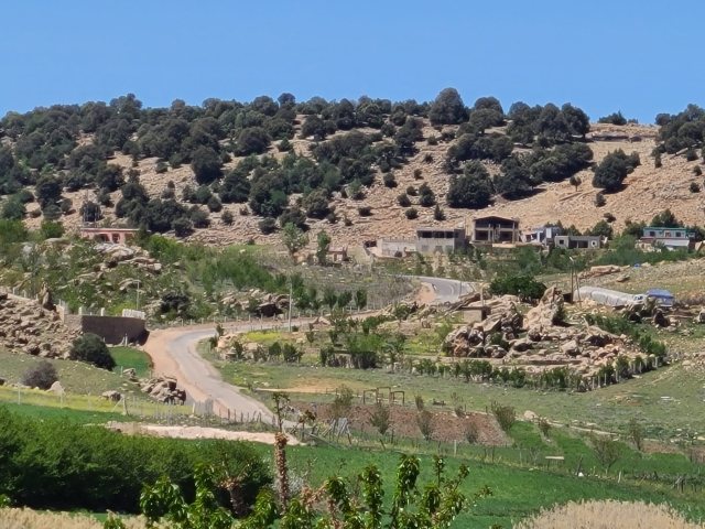 Bild: Landschaftsbild bei Tafraoute Die karge, felsige Dramatik wich einer fast überraschenden Üppigkeit. In der engen Schlucht von Aït Mansour säumen Palmenhaine den Weg, Wasserläufe durchziehen das Tal, und zwischen den steilen Felswänden entsteht eine grüne Oase, die beinahe unwirklich erscheint. Die Straße folgt dem Verlauf des Wassers, manchmal direkt daneben, manchmal leicht erhöht – immer begleitet vom Wechselspiel aus Licht und Schatten.