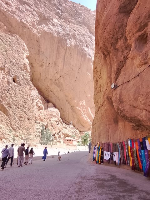 Direkt danach ging es noch in eine Polsterei, wo Wolfgangs aufge-rissenes Hosenbein kurzerhand mit einem Stück Leder geflickt wurde – inklusive netter Unterhaltung und viel Gelächter. Am Nachmittag nahmen wir die letzten Kilometer in Richtung Todra-Schlucht unter die Räder. Die Schlucht gehört zu den spektakulärsten Landschaften Marokkos: Steile, bis zu 300 Meter hohe Felswände ragen hier dicht aneinander, während sich unten ein schmaler Flusslauf und eine Straße hindurchschlängeln. Entsprechend groß war der Andrang – viele Touristen, Souvenirverkäufer und reger Verkehr bestimmten das Bild. Bild: Noch vor der Todra-Schlucht kamen wir an diesen Andenkenverkäufern vorbei, die hier ihre Ware anbieten. Wolfgang musste natürlich ein Turban-Tuch kaufen... Offenbar steht morgen eine Radveranstaltung an – überall sahen wir bereits Fahnen und Vorbereitungen, und uns wurde gesagt, dass die Schlucht zeitweise gesperrt sein soll.