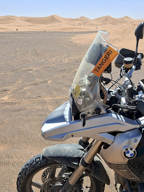 Bild: morgendliches Erwachen im Zelt Umso dankbarer waren wir für die dicken Decken und warmen Bezüge – denn trotz Wüste fiel die Temperatur in den frühen Morgenstunden auf nur etwa 7 Grad. Eine Erinnerung daran, dass die Sahara nachts alles andere als heiß ist. Gegen 9 Uhr hieß es Abschied nehmen vom Zeltlager. Wir verstauten unser Gepäck wieder im Begleitfahrzeug, und unser Guide brachte uns zusammen mit zwei weiteren Gästen zurück durch die Dünenlandschaft zum Wüstenhotel, wo unsere Motorräder auf uns warteten.