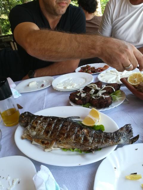 Irgendwo vor Erseka standen dann diese beiden Motorradfahrer auf ihren leichten Enduros am Straßenrand. Ich stoppte, um nachzufragen, ob alles in Ordnung sei. Es waren zwei Einheimische aus Elbasan, die sich auf einem Sonntagsausflug in den südlichen Landesteil Albaniens aufgemacht hatten. Es war aber alles ok und nach einem kurzen Gespräch fuhren wir weiter. Kurz vor Borova überholten sie uns dann auf ihren leichten 250er Enduros, die für diese kleinen Straßen eigentlich viel besser geeignet sind. Wir hielten wieder an und die beiden stellten sich als Enri und Timi - ob die Namen wirklich genauso geschrieben werden, da bin ich mir nicht so sicher, aber so ähnlich heißen sie - vor. Enri berichtete, dass dieser Ort Borova, auf den wir jetzt gerade schauten Bekanntheit erlangte, als ihn deutsche Soldaten während des Zweiten Weltkriegs dem Erdboden gleichmachten und unter der Zivilbevölkerung ein Massaker anrichteten. Der Ort liegt im hügeligen Bergland von Kolonja auf rund 960 m ü. A. Die Straße von Korça nach Përmet und weiter nach Tepelena, die einzige asphaltierte Verbindung in der Region, führt durch die Ortschaft. Sie ist die einzige direkte Verbindung zwischen dem Südosten und dem Süden Albaniens. aus Wikipedia: "Am 6. Juli 1943 verübte die Wehrmacht ein Massaker unter der Bevölkerung von Borova: Die Deutschen erschossen Menschen und zündeten Häuser an. Die Dorfbewohner sollen Partisanen, die zuvor eine deutsche Wagenkolonne angegriffen hatte, unterstützt haben. Sämtliche 100 Gebäude der Ortschaft wurden von den Soldaten angezündet oder schwer beschädigt. 107 Zivilisten sind bei diesem schwersten Verbrechen der Wehrmacht in Albanien getötet worden – darunter vor allem Kinder, Frauen und Ältere... ... Im kommunistischen Albanien wurde das Gedenken an das Massaker aufrechterhalten. Ein Denkmal und ein kleines Museum erinnerten an das Verbrechen." Enri und Timi wollten zur FarmaSotira, ein Campingplatz mit einem sehr guten Restaurant, der auch Hütten und Zimmer zum Übernachten anbietet. Hier hatte ich bereits im letzten Jahr im September eine Nacht verbracht. Da Reini und ich auch vorhatten, hier eine erste Pause einzulegen, beschlossen wir vier, gemeinsam dorthin zu fahren, um einen Kaffee zu trinken, zu dem wir unsere beiden neuen Bekanntschaften einladen wollten. Die Strecke führte über hügeliges Gelände und auch durch viele wohlriechende Waldabschnitte, in denen es wunderbar nach Akazien roch und wo die Temperaturen angenehmer waren. Es war echt herrlich hier hindurch zu kommen. Bald hatten wir die FarmaSotira erreicht, die an diesem Sonntag auch von anderen, zumeist Einheimischen, sehr gut besucht war. Dass man hier sehr gut essen kann, hatte sich offenbar herumgesprochen. Unsere beiden neuen Bekannten wollten dies hier auch tun und so schlossen wir uns ihnen an und bestellten fangfrischen Fisch aus den hiesigen Becken und ein spezielles Fleischgericht der Gegend, das wie Enri erzählte vier Stunden lang im Feuer gart und entsprechend zart war. Das Essen wurde auf vielen größeren Tellern auf den Tisch gestellt und jeder konnte sich nehmen, wovon und soviel er wollte. Als wir nach dem abschließenden Kaffee dann unsere beiden neuen Freunde einladen wollten, hatte Enri zwischenzeitlich und unbemerkt das Ganze bereits bezahlt und weigerte sich, von uns etwas für das Schmausen zu bekommen. Wieder einmal haben wir die große Gastfreundschaft der Albaner kennenlernen dürfen. Wir waren beide platt und bedankten uns vielmals dafür. Falls Enri mal nach Deutchland kommt, will ich mich gerne dafür revanchieren. Ich gab ihm für diesen Fall dann auch meine Adresse. Vielleicht nutzt er sie ja mal eines Tages! Am frühen Nachmittag hatten wir den kleinen Grenzübergang bei Tre Urat erreicht. Die Temperatur war mittlerweile auf 36,5° C gestiegen. Nach etwas Warterei unter dem Hallendach auf griechischer Seite konnte unsere Reise dann fortgesetzt werden auf sehr guten griechischen Straßen immer im Grenzgebiet zu Albanien bleibend. Wir hatten eine Tour über den Übergang bei Drymades geplant, doch als wir die letzten Kilometer auf leeren, nur von Kühen, Schafen und Ziegen bevölkerten Straßen unterwegs waren, kam mir die Sache bereits etwas suspekt vor. Als wir schließlich vor einer Straßensperre halt machen mussten, wurde mir klar, dass dieser Übergang wohl für den Fahrzeugverkehr geschlossen war. Ich fragte einen Uniformierten am in der Nähe stehenden Container und der meinte dann, dass der Übergang nur den im angrenzenden Dorf Ansässigen gestattet sei. Unverrichteter Dinge mussten wir also wieder umkehren und zum einige Kilometer weiter westlich gelegenen Übergang bei Kakavija fahren. An dem größeren Übergang war natürlich viel mehr los und wir hatten einige Zeit auf der schattenlosen Zufahrt zu warten, bis wir endlich wieder auf albanischem Boden waren. Bis Gjirokaster, wo wir heute unseren letzten Abend in Albanien verbringen wollten, waren es nun nur noch 35 km. Wir fuhren wieder zum Hotel an der Hauptstraße, wo ich bereits im Vorjahr zwei Nächte verbracht hatte. (Für je 10 € inkl. WLAN.) Dann ging es hinauf zur Besichtigung der Stadt der 1.000 Stufen. Der Frisörsalon, wo ich mir im letzten Jahr noch die Haare habe schneiden lassen, war leider nicht mehr da. Schade! Da hatte ich mich total drauf gefreut, auf die Show des Barbiers. Es begann dunkel zu werden. Wir kauften uns zwei Büchsen Bier und schlenderten zur Burg hoch, wo auch ein Militärmuseum ist. Leider schließt es gegen 19.30 Uhr und so beschlossen wir, uns in der aufziehenden Dunkelheit uns die Stadt von hier oben bei einem Bierchen anzuschauen. Wir wollen am nächsten Vormittag nochmals mit den Motorrädern hier hoch fahren und uns dann das Ganze bei Tageslicht anschauen. Tagesfahrleistung: 247 kim ![]() Bild: In unserem Hotel in Pogradec ![]() Bild: Frühstück am Sonntag Morgen in Pogradec ![]() Bild: ein letzter Spaziergang am Ohrit-See ![]() Bild: Spaziergang a