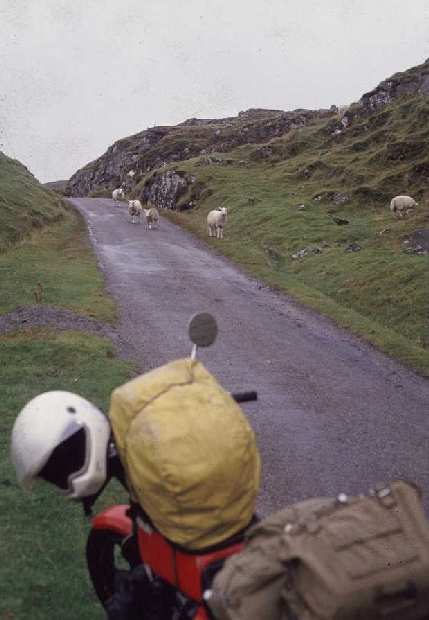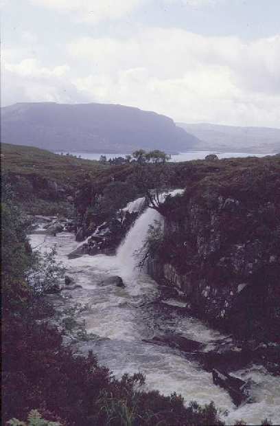 Bis zum Mittag meint es das Wetter am nächsten Tag gut mit mir. Den Großteil der heutigen Strecke(380 km) bin ich auf einspurigen Fahrbahnen mit "passing places" unterwegs durch schöne und einsame Gegenden. Der Inverpolly-District ist paradiesisch zum Motorradfahren. Über steile Straßen in oft schlechtem Zustand geht es durch Gebiete mit Heide- und Rhododendronbewuchs, oft auch vorbei an Azaleensträuchern oder einzeln stehenden Birken. Es ist eine moorige Gegend mit vielen kleineren Seen und Wasserfällen. Ständig muss man hier mit auf der Straße laufenden Schafe rechnen.