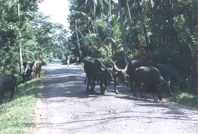 Hier trafen wir wie bereits häufiger schon auf unserer Tour Wasserbüffel, diesmal jedoch auf der Straße. Wir waren auf dem Weg Richtung Südküste. Zwischendurch kaufte ich in einer Hütte noch 3 Flaschen Arrack ein, wobei ich mit erheblichen Verständigungsproblemen zu kämpfen hatte. Der Verkäufer konnte sich nämlich einfach nicht vorstellen, dass man lieber 3 kleine als eine große Flasche haben wollte. Ursprünglich hatte ich sie als Geschenk mitbringen wollen. Der Gedanke mit dem Verschenken der Arrak-Flaschen hielt jedoch nur wenige Stunden, denn schon bald nach unserer Einkehr ins Resthouse in Hambantota ließ ich mir die Idee zusammen mit Reini noch mal gut durch den Kopf gehen. - 10/11 - ![]()