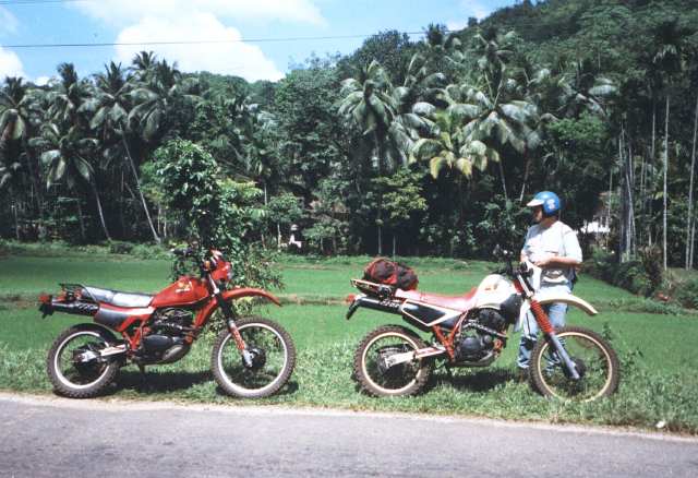 Sri Lanka - 2 Wochen, 1999mit Miet-Enduros unterwegs durch Sri-Lanka, vorbei an Reisfeldern und badenden Büffeln, durch weite Teeplantagen die Berge hinauf bis zum Worlds EndPer TucTuc ging´s also zum Verleih und nach längerem Verhandeln und diversen Probefahrten hatten wir dann 2 annehmbare Exemplare, eine XT 250 und eine XL 250, gemietet für 6 Tage zu etwa je 20 DM pro Tag. Die Honda war trotz gleichem km-Stand in wesentlich besserem Zustand als die Yamaha, wenngleich auch ihr Hinterradreifen bereits abgefahren war. Die Kette der XT war jetzt schon weit über dem Verschleißmaß. Nach unserer 800-km-Tour hing sie total schlaff herunter.Auf dem Rückweg zu unserem Hotel überholten wir dann diese Verkehrsteilnehmer. In einer kleinen Bucht, in der wir auch etwas Schatten fanden, unterbrachen wir unsere erste Strecke mit den fremden Motorrädern, um zu baden. Reini war mit der XT nicht sehr zufrieden und wollte sie am nächsten Tag zurückbringen. Aber wir tauschten später nur untereinander häufiger die Mopeds und gewöhnten uns an das ausgelutschte Teil mit der schlabbernden Kette, dem nichtfunktionierenden Blinker, der hakenden Kupplung... Die am Abend im Hotel noch erlebte Feuerschlucker-Show war ein netter Abschied für die nächsten Tage. Wir waren beide froh, das Hotel am nächsten Tag endlich verlassen zu können. Nach einem Ewigkeiten dauernden Geldumtausch konnte es dann schließlich losgehen. Der Weg führte zunächst ein Stück in nördliche Richtung die Küste entlang, um dann im groben Uhrzeigersinn die Küste im Süden zu erreichen und an ihr wieder hochzukriechen. Was auffiel, aber auch zu erwarten war, sind die dem Touristen gegnüber abseits der Küstenstriche veränderte und sicherlich ursprüngliche Einstellung. Wir fühlten uns bis in den großen Hotels "Orient" und "Resthouse" oder am Nationalpark, wo wir für eine Unterkunft 40 Dollar zahlen sollten, nirgendwo über´s Ohr gehauen. Die Menschen sind abseits des Tourismus - wie vermutlich in den meisten anderen Ländern auch - neugierig, aber nicht aufdringlich, sonder eher schüchtern. Speziell bei der Fahrt durch´s Inland durch Reisfelder, vorbei an badenden Büffeln, die Berge hinauf in die Teeplantagen, haben wir oft uns zulächelnde und winkende Menschen gesehen. Auch viele schöne Mädchen waren darunter, so. z.B. unter den Teepflückern und natürlich Kinder, die uns am Wegrand zuwinkten. Wir sahen viel Regenwald und Reisanbau. Irgendwo zwischen Matugama und Kalawana legten wir die erste längere Pause ein und gönnten uns Fanta und Kekse in einem kleinen Geschäft. Auf der Weiterfahrt nach Ratnapura trafen wir auf einen Beerdigungszug. Ratnapura, die prosperierende Metropole des Edelsteinhandels, liegt etwa 100 km südwestlich Colombos am Fuß des steil aufragenden Hochlands mit dem Adam´s Peak. Die noch heute anhaltende Goldgräberstimmung im Raum Ratnapura bringt Geschäftsleute aus der ganzen Welt hierher. Hier trafen wir bei einem Orientierungshalt auf eine Gruppe kleinerer Jungs, die uns Edelsteine anboten. Wir konnten uns von ihrem zweifelhaften Angebot jedoch noch fernhalten. Karte ![]() ![]() ![]() ![]()