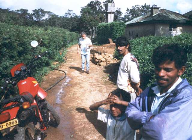 Sri Lanka - 2 Wochen, 1999mit Miet-Enduros unterwegs durch Sri-Lanka, vorbei an Reisfeldern und badenden Büffeln, durch weite Teeplantagen die Berge hinauf bis zum Worlds End![]() Interessant waren auch die Studenten, die wir am World´s End trafen. Durch deren Rufen waren wir erst die letzten entscheidenden Meter gelaufen und fanden so unser Ziel. Ein Schritt zurück bedeutet hier 1300 m tiefer !! Zurück aus dem Dschungel auf der Plantage, wo wir unsere Motorräder abgestellt hatten. Das Fahren über die Schotterwege der Plantagen war eine Herausforderung, die wieder einmal sehr viel Spaß brachte. Wir fanden im Inland zwischen den Teeplantagen in den höheren Gebieten ein Endurado ersten Grades mit vielen engen Kurven und Kehren in häufig schlechtem Zustand und entsprechenden Schwierigkeitsgraden. Auf dieser Tour hatten wir in Erwartung indischer Verhältnisse kein Werkzeug, nicht einmal einen Reifenventilausdreher, den wir einmal tatsächlich brauchten, dabei. Aber in dem Gebiet der Teeplantagen hat man eigentlich so gut wie gar nicht die Möglichkeiten mal schnell einen defekten Schlauch vulkanisieren oder eine gerissene Kette neu vernieten zu lassen. Wäre hier etwas kaputt gegangen, hätten wir sicherlich länger auf Hilfe warten müssen. ![]() ![]() ![]() ![]()
