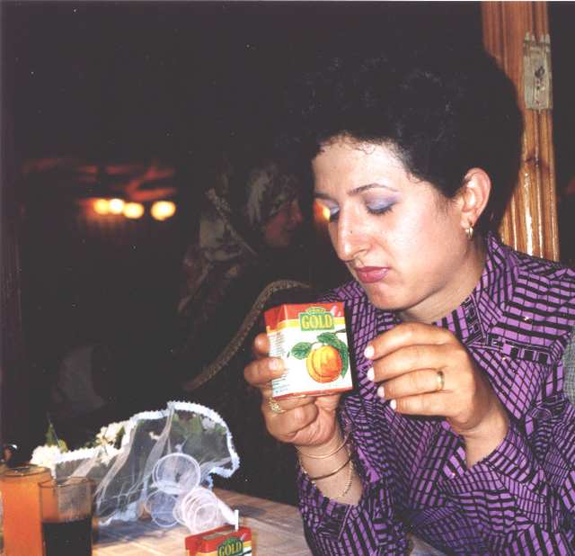 Zu Essen und Trinken gab es wieder Gebäck und Tetra-Pack-Getränke (s. Bild). Später am Abend bekam jeder noch ein Stück der mehrstöckigen Hochzeitstorte. Gegen 24 Uhr schließlich war der offizielle Teil der Feier zu Ende. Die Leute wurden in Busse oder Autos geladen und nach Hause gebracht. Alkoholprobleme gibt es bei solchen Feiern keine. Andrea und ich sind zwar erst um drei Uhr ins Bett gegangen,und damit hatten wir uns als Fremde eindeutig zu erkennen gegeben.