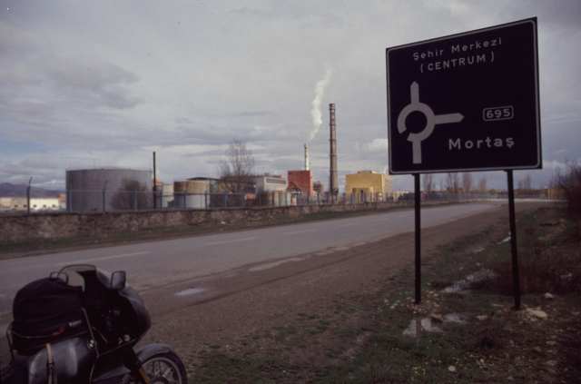 Aluminiumfabrik Ich komme an einer Aluminiumfabrik vorbei, die sich bereits mehrere Kilometer zuvor durch ihre giftig bunten Abgase angekündigt hat. Hinter dem Abzweig nach Mortas werde ich von einem einzelnen Polizisten gestoppt, der wissen will, woher ich komme und wohin ich will. Nachdem ich ihm mein Ziel erklärt habe lässt er mich bald darauf weiter fahren. Die Strecke ist bald darauf nicht mehr befestigt.
