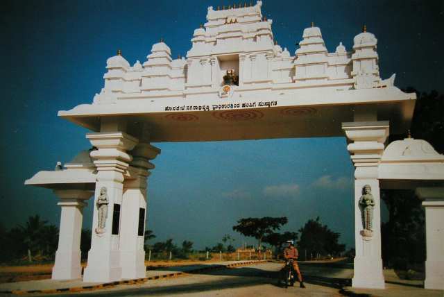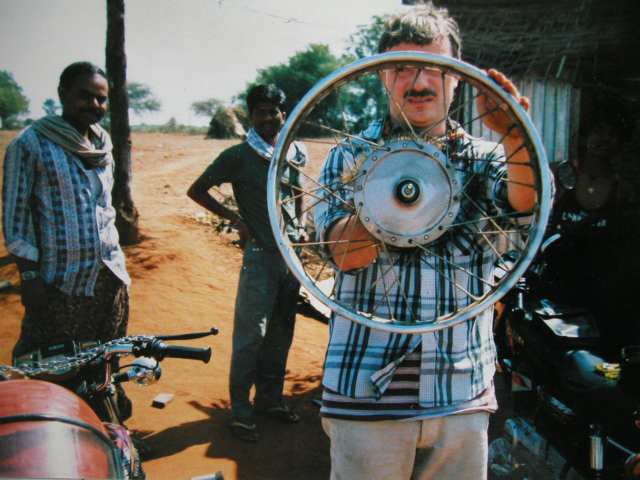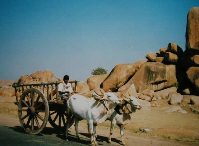 Karte: unsere Reiseroute ![]() Andere Schnellstraßenbenutzer ![]() Auf der "Schnellstraße" in Richtung Hospet hatte Reinhold nach einem Schlagloch die erste Reifenpanne. Eine Reparaturwerkstatt fanden wir glücklicherweise schnell. Hospet ist eine relativ große Stadt mit sehr viel Verkehr und Geschäftigkeit. Hier fanden wir ein sehr gutes Hotel für 15 DM pro Person und Tag. Wir hatten sogar eine warme Dusche und TV. Am Abend machten wir einen Spaziergang durch die sehr belebte staubige Stadt, kauften Nüsse und andere Kleinigkeiten, fanden aber nirgendwo eine Möglichkeit ein Bier zu trinken. Also beauftragten wir einen Rikschafahrer damit, uns zum Bier zu bringen. Wir kamen zu einem großen Garten, wo auch noch einige andere Europäer saßen. Auf dem Nachhauseweg wurden wir von einem aus einem Hinterhof auftauchenden Inder gefragt, ob wir Gras kaufen wollten.