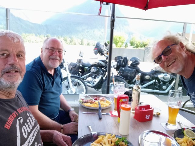 Bild: Abendessen mit Wolfgang und Reinhard Eine Woche lang wird Neukirchen am Großvenediger zum Treffpunkt für alle, die Motorräder nicht nur fahren, sondern fühlen. Hier geht es um das Wesentliche: Gemeinsame Ausfahrten durch alpine Traumkulissen, Schrauberstunden unter freiem Himmel, Gespräche über Technik und Träume. Kein Lärm, kein Stress nur der Klang von Motoren und echter Begegnung.